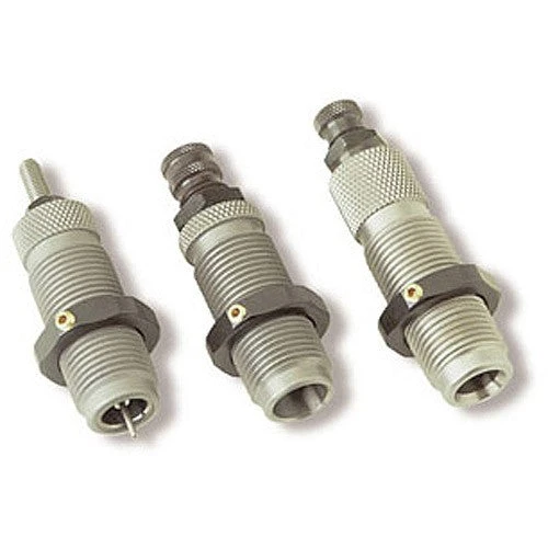 The 3-Die Set has a sizer die with decapping unit, an expander die and a seater die with crimp. Cases must be lubed prior to sizing.